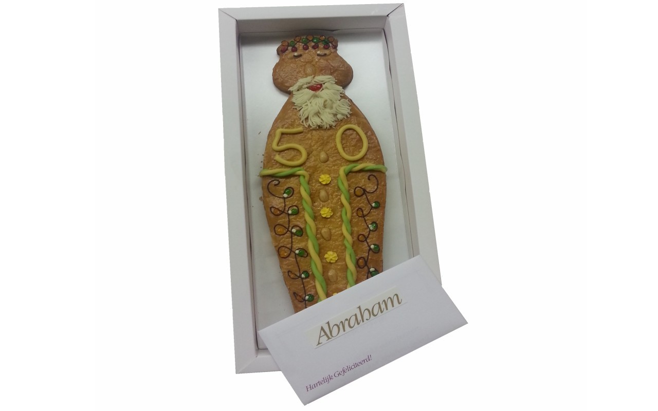 Koek Abraham / Sara gevuld met amandelspijs en diversen gebruneerde noten. Afgewerkt des banketbakkers met o.a Marsepein, jam en chocolade. Verpakt in een mooie bijpassende doos. Incl. oorkonde.